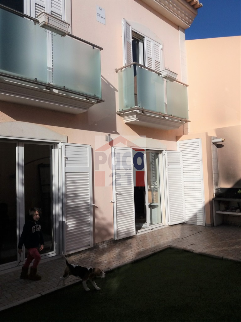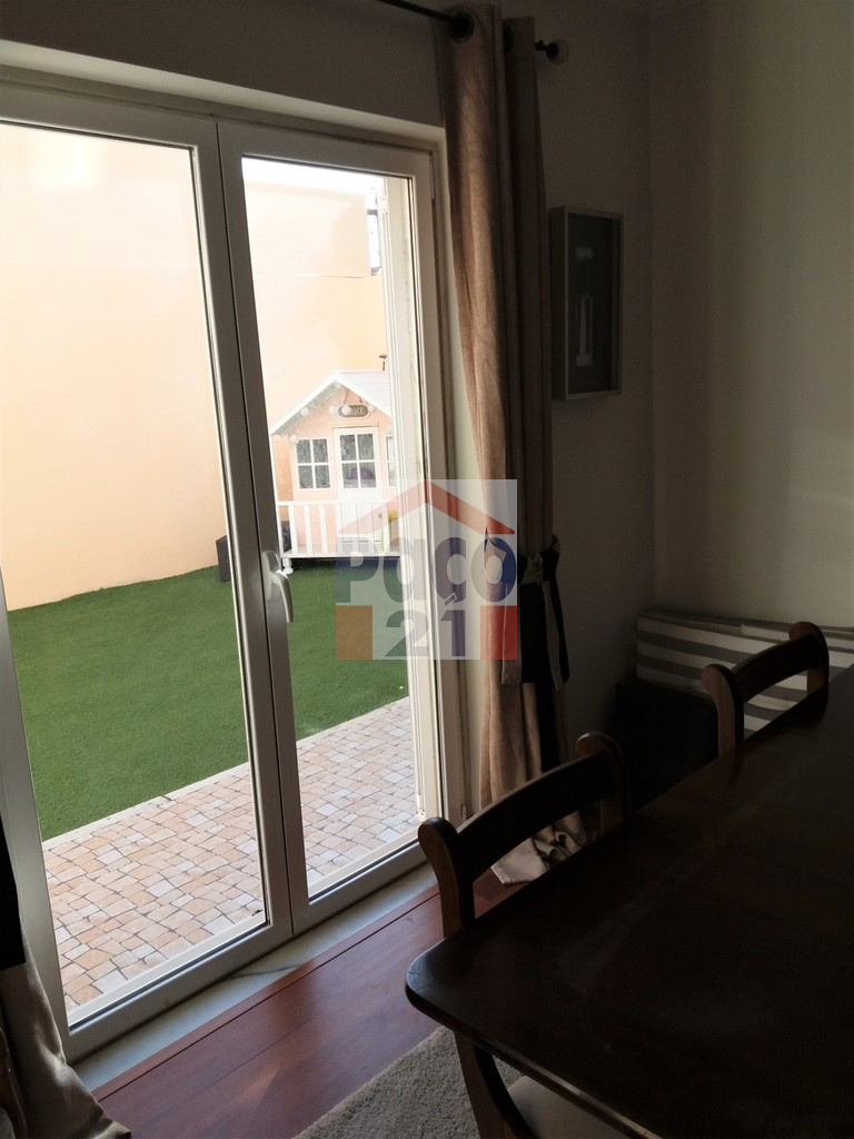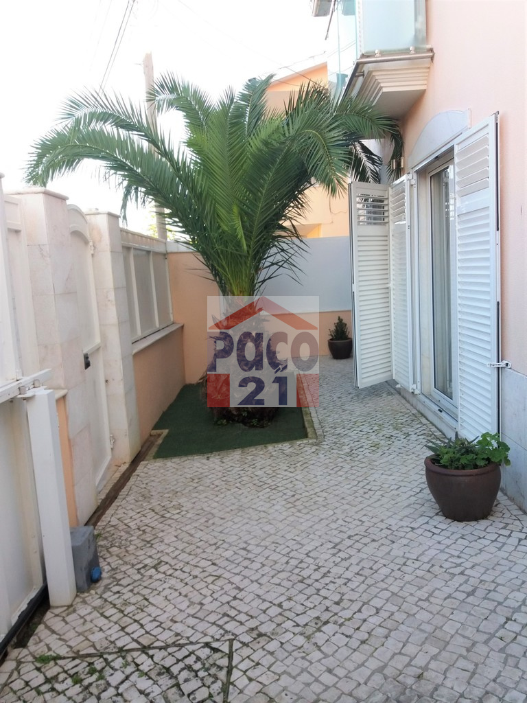 No exterior tem um jardim com cerca de 50m2 e um alpendre com estacionamento para dois veículos.